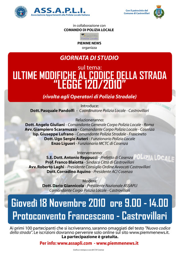 IL 18 NOVEMBRE DALLE ORE 9 ALLE 14 PRESSO IL PROTOCONVENTO FRANCESCANO DI CASTROVILLARI GIORNATA DI STUDIO SUL TEMA: " MODIFICHE AL CODICE DELLA STRADA - LEGGE 120/2010 ", A CURA DELL' ASSAPLI IN COLLABORAZIONE CON PIEMMENEWS.IT |