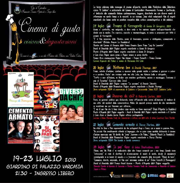 SI TERRA' DAL 19 AL 23 LUGLIO PRESSO IL GIARDINO DI PALAZZO VARCASIA A CASTROVILLARI LA TERZA EDIZIONE DI CINEMA ALL' APERTO, QUEST' ANNO DENOMINATA: " CINEMA DI GUSTO, VISIONI &DEGUSTAZIONI " |