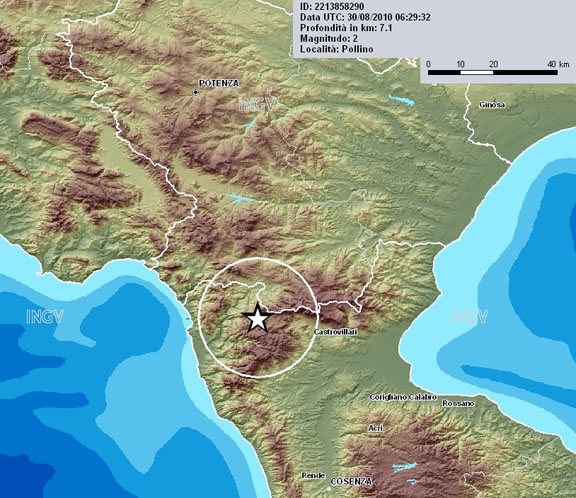 UN TERREMOTO DI MAGNITUDO ( ML) 2, E' STATO REGISTRATO ALLE ORE 08:29:32 ITALIANE DEL GIORNO 30/AGO/2010 (06:29:32 30/AGO/2010 - UTC), DALLA RETE SISMICA NAZIONALE DELL' INGV NEL DISTRETTO SISMICO: POLLINO |