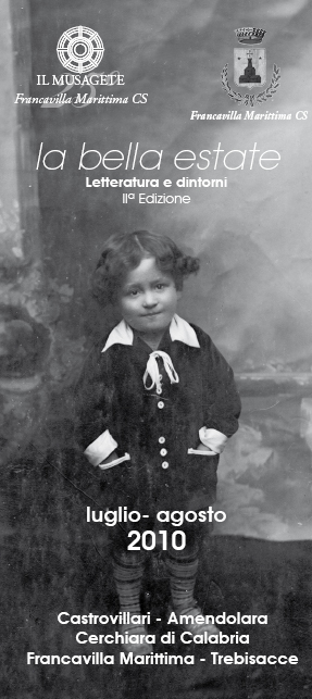 DOPPIO APPUNTAMENTO CON ELIO PECORA ALLA SECONDA EDIZIONE DE “ LA BELLA ESTATE “ - PARTE SABATO 24 LUGLIO 2010 DA CASTROVILLARI LA SECONDA EDIZIONE DE LA BELLA ESTATE – LETTERATURA E DINTORNI - L’EVENTO, ORGANIZZATO DA “IL MUSAGETE” DI FRANCAVILLA MARITTIMA È ITINERANTE E SI SVOLGERÀ QUEST’ANNO A CASTROVILLARI, AMENDOLARA, CERCHIARA DI CALABRIA, FRANCAVILLA MARITTIMA E TREBISACCE. QUESTO È IL CALENDARIO DEGLI APPUNTAMENTI: CASTROVILLARI SABATO 24 LUGLIO 2010 , ORE 19,00, GIARDINO DEL PALAZZO VARCASIA , PRESENTAZIONE DEL LIBRO DI POESIE DI LEONE D’AMBROSIO NON È ANCORA L’ADDIO(AZIMUT EDITORE). INTERVENGONO: ELIO PECORA, BONIFACIO VINCENZI. COORDINA: ORESTE BELLINI. READING A CURA DI FILOMENA BLOISE. SARÀ PRESENTE L’AUTORE. AMENDOLARA MARINA DOMENICA 25 LUGLIO 2010 , ORE 19,00, GRILLO HOTEL FIN DENTRO IL RISO O IL GRIDO… - PERCORSI DI LETTURA NELL’OPERA DI ELIO PECORA. INTERVENGONO: BONIFACIO VINCENZI, PINO CORBO, ANGELA LO PASSO, PIERINO GALLO, ROCCO TALIANO GRASSO. COORDINA: ORESTE BELLINI. READING A CURA DI FILOMENA BLOISE. SARÀ PRESENTE ELIO PECORA. CERCHIARA DI CALABRIA SABATO 31 LUGLIO 2010 , ORE 19,00, PIAZZETTA ANTISTANTE LA CHIESA DI S. PIETRO APOSTOLO, PRESENTAZIONE DEL LIBRO DI POESIE DI BONIFACIO VINCENZI LA TEMPESTA PERFETTA (ALJON EDITRICE). INTERVENGONO: RITA CERCHIARA (PRES. ASS. PRO CERCHIARA), ANTONIO CARLOMAGNO (SINDACO DI CERCHIARA) COORDINA: ANGELA LO PASSO. READING A CURA DI FILOMENA BLOISE. SARÀ PRESENTE L’AUTORE. FRANCAVILLA MARITTIMA GIOVEDÌ 5 AGOSTO 2010, ORE 21,00, ANTIQUARIUM – TIMPONE DELLA MOTTA, PRESENTAZIONE DEL LIBRO DI POESIE DI STELVIO DI SPIGNO LA NUDITÀ (PERQUOD EDIZIONI). INTERVENGONO: PINO ALTIERI ( PRES. SCUOLA INT. DI ARCHEOLOGIA “LAGARIA”) PAOLO GALLO (DIRETTORE FONDAZIONE BRETTION) EMILIA SIRANGELO, BONIFACIO VINCENZI. COORDINA: ANGELA LO PASSO. READING A CURA DI FILOMENA BLOISE. SARÀ PRESENTE L’AUTORE. |