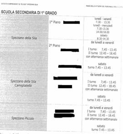 COME SI PUÒ VEDERE DALLE IMMAGINI, LA SCUOLA RESTA APERTA 11 ORE AL GIORNO PER 5 GIORNI ALLA SETTIMANA, DOVEVANO QUINDI SCATTARE LE 35 ORE PER I SETTE COLLABORATORI SCOLASTICI INTERESSATI. MA DI QUESTO (CHI NON SI FIDA, PUÒ CONTROLLARE) SULLA CONTRATTAZIONE D’ISTITUTO NON C’È TRACCIA. ANCORA, SE CI SI SOFFERMA UN PO’ SULL’ORARIO DEL COLL.SCOL. DEL 1° PIANO, SI PUÒ DESUMERE CHE IL SUO ORARIO DI LAVORO SETTIMANALE È DI 44 ORE (CHISSÀ A QUALE CCNL FA RIFERIMENTO). HO FATTO DUE SEMPLICI CALCOLI, LE ORE SOTTRATTE SONO 40 A TESTA (UN‘ORA PER 40 SETTIMANE CIRCA). A QUESTE ANDREBBERO AGGIUNTE TUTTE LE ORE PER RIUNIONI, CORSI, PON, ATTIVITÀ RICADENTI NEL PERIODO FUORILEGGE E CIOÈ DALLE ORE 17.30 ALLE ORE 18.45, (È STATO TUTTO STUDIATO CON METODO) CHE SONO QUINDI STATE FATTE RIENTRARE NELL’ORARIO ORDINARIO, PER UN ESPROPRIO DI ALTRE 10 ORE A TESTA. UN FURTO LEGALIZZATO DI 50 ORE PER 7 COLL.SCOL. PER UN TOTALE DI 350 ORE. ECCO SCOPERTE LE ECONOMIE FATTE SUL FIS AI DANNI DEI PIÙ DEBOLI, CIOÈ QUELLI CHE NON ANDRANNO MAI A VERIFICARE SE UN PIANO DELLE ATTIVITÀ E UNA CONTRATTAZIONE D‘ISTITUTO SONO CONFORMI AL CCNL, O PERCHÉ SI FIDANO TROPPO CIECAMENTE DEI LORO RAPPRESENTANTI SINDACALI.