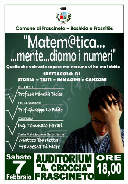 MATEM@TICA...MENTE...DIAMO I NUMERI, SPETTACOLO DI STORIA, TESTI, IMMAGINI E CANZONI, TORNA IN SCENA SABATO 7 FEBBRAIO A PARTIRE DALLE ORE 18,00 A FRASCINETO. L' EVENTO SI TERRA PRESSO L' AUDITORIUM " A. CROCCIA ", INTERVERRANNO: PER I TESTI LA PROF.SSA MINELLA BLOISE E PER LE MUSICHE, IL PROF. GIUSEPPE LO POLITO, COORDINERA', L' ING.TOMMASO FERRARI CON LA PARTECIPAZIONE STRAORDINARIA DI: MATTEO BARLETTA E FRANCESCA DI MARE. |
