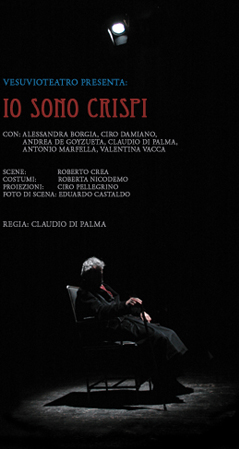 METTERE IN SCENA TEMI E PERSONAGGI DELLA STORIA ITALIANA ATTRAVERSO "DIALOGHI POSSIBILI". LEZIONE DA PORTARE IN PALCOSCENICO. SCOMMESSA DIFFICILE. CI RIESCONO GLI ATTORI DI VESUVIOTEATRO PER IL PROGETTO "STORIE INTERROTTE", AL NUOVO CON “IO SONO CRISPI” DI PAOLO PATUI DA DIALOGHI DI GIUSEPPE ASTUTO E RAFFAELE ROMANELLI. COMPLESSO PERCORSO CHE CLAUDIO DI PALMA, REGISTA, E ANCHE PROTAGONISTA PER UN FRANCESCO CRISPI D’ASCETICA CONTENUTEZZA, COMPIE IN RAPIDO GIOCO DI MEMORIA, RICORRENDO A POSSIBILI SUGGESTIONI E INVENZIONI DI DRAMMATURGIA. CON LUI IN BELLA SQUADRA ALESSANDRA BORGIA, CIRO DAMIANO, ANDREA DE GOYZUETA, ANTONIO MARFELLA E VALENTINA VACCA. PREZIOSE ATMOSFERE RAREFATTE SUGGERITE ANCHE DALLA SCENOGRAFIA DI ROBERTO CREA DALLE PROIEZIONI DI CIRO PELLEGRINO E DAI COSTUMI DI ROBERTA NICODEMO. CERCANDO DI SFUGGIRE ALLE SECCHE DEL DIDASCALISMO IN AGGUATO. SPETTACOLO COMPIUTAMENTE "UTILE" E VOGLIA DI "RILETTURA" E/O "RIFLESSIONE" NON SOLTANTO NEGLI SPETTATORI PIÙ GIOVANI. (GIULIO BAFFI DE LA REPUBBLICA) - L' UFFICIO STAMPA A CURA DI DOMENICO DONATO