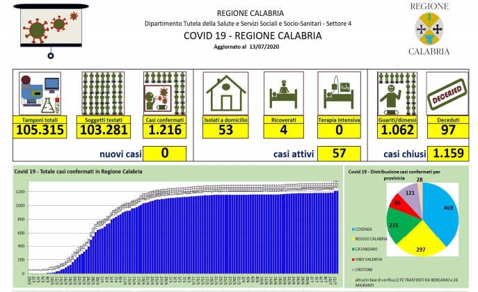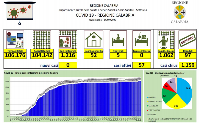 Covid-19 bollettino giornaliero della regione Calabria - In Calabria ad oggi le persone risultate positive al Coronavirus sono 1.216 (+0 rispetto a ieri), 97 le persone decedute. Territorialmente, i casi positivi sono così distribuiti: - Catanzaro: 1 in reparto; 1 in isolamento domiciliare; 183 guariti; 33 deceduti, - Cosenza: 1 in isolamento domiciliare; 434 guariti; 34 deceduti, - Reggio Calabria: 3 in reparto; 19 in isolamento domiciliare; 256 guariti; 19 deceduti, - Crotone: 3 in isolamento domiciliare; 112 guariti; 6 deceduti, - Vibo Valentia: 3 in isolamento domiciliare; 77 guariti; 5 deceduti. Il totale dei casi di Catanzaro comprende soggetti provenienti da altre strutture e province che nel tempo sono stati dimessi. Le persone decedute vengono indicate nella provincia di provenienza e non in quella in cui è avvenuto il decesso. Dall'ultima rilevazione, le persone che si sono registrate sul portale della Regione Calabria per comunicare la loro presenza sul territorio regionale sono in totale 7.956. Nel conteggio sono compresi anche i due pazienti di Bergamo trasferiti a Catanzaro, mentre non sono compresi i numeri del contagio pervenuti dopo la comunicazione dei dati alla Protezione Civile Nazionale.
