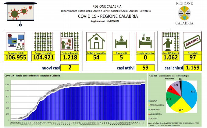 Covid-19, bollettino giornaliero della regione Calabria - In Calabria ad oggi le persone risultate positive al Coronavirus sono 1.231 (+5 rispetto a ieri: tre casi rilevati al laboratorio dell’Asp di Reggio Calabria sono riconducibili allo sbarco di Roccella Jonica dell’11/07/2020. I due casi rilevati presso l’Azienda Ospedaliera di Catanzaro sono rientri da stato estero), 97 quelle decedute. Territorialmente, i casi positivi sono così distribuiti: - Catanzaro: 2 in reparto; 1 in isolamento domiciliare; 183 guariti; 33 deceduti, - Cosenza: 10 in isolamento domiciliare; 435 guariti; 34 deceduti, - Reggio Calabria: 4 in reparto; 18 in isolamento domiciliare; 256 guariti; 19 deceduti, - Crotone: 2 in isolamento domiciliare; 113 guariti; 6 deceduti, - Vibo Valentia: 3 in isolamento domiciliare; 78 guariti; 5 deceduti. Il totale dei casi di Catanzaro comprende soggetti provenienti da altre strutture e province che nel tempo sono stati dimessi. Le persone decedute vengono indicate nella provincia di provenienza e non in quella in cui è avvenuto il decesso. Dall'ultima rilevazione, le persone che si sono registrate sul portale della Regione Calabria per comunicare la loro presenza sul territorio regionale sono in totale 7.855. Nel conteggio sono compresi anche i due pazienti di Bergamo trasferiti a Catanzaro, mentre non sono compresi i numeri del contagio pervenuti dopo la comunicazione dei dati alla Protezione Civile Nazionale.