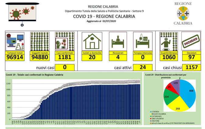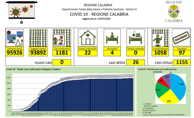 Covid-19, bollettino giornaliero della regione Calabria -In Calabria ad oggi le persone risultate positive al Coronavirus sono 1.181 (+0 rispetto a ieri), 94.880 i tamponi effettuati, 97 le persone decedute. Territorialmente, i casi positivi sono così distribuiti: - Catanzaro: 1 in reparto; 1 in isolamento domiciliare; 182 guariti; 33 deceduti, - Cosenza: 1 in isolamento domiciliare; 433 guariti; 34 deceduti, - Reggio Calabria: 2 in reparto; 16 in isolamento domiciliare; 256 guariti; 19 deceduti, - Crotone: 1 in isolamento domiciliare; 112 guariti; 6 deceduti, - Vibo Valentia: 1 in reparto; 1 in isolamento domiciliare; 77 guariti; 5 deceduti. Il totale dei casi di Catanzaro comprende soggetti provenienti da altre strutture e province che nel tempo sono stati dimessi. Le persone decedute vengono indicate nella provincia di provenienza e non in quella in cui è avvenuto il decesso. Dall'ultima rilevazione, le persone che si sono registrate sul portale della Regione Calabria per comunicare la loro presenza sul territorio regionale sono in totale 8.323. Nel conteggio sono compresi anche i due pazienti di Bergamo trasferiti a Catanzaro, mentre non sono compresi i numeri del contagio pervenuti dopo la comunicazione dei dati alla Protezione Civile Nazionale.