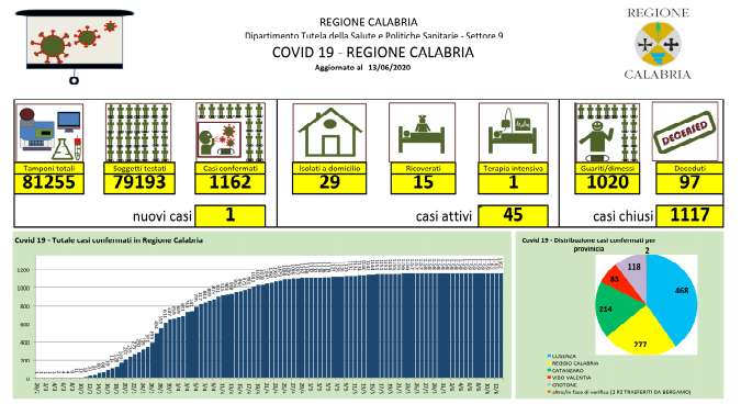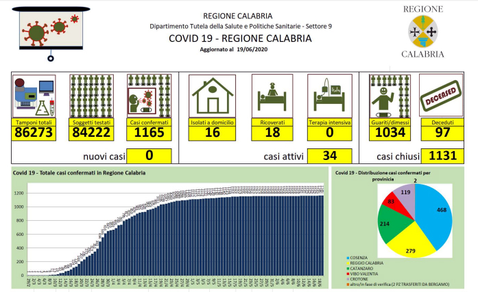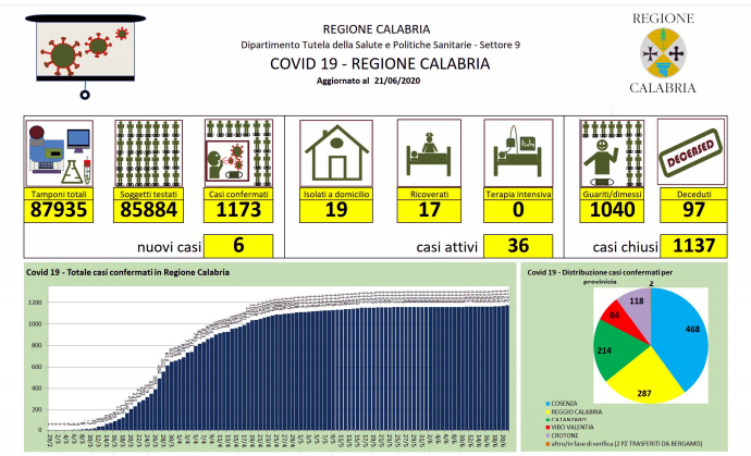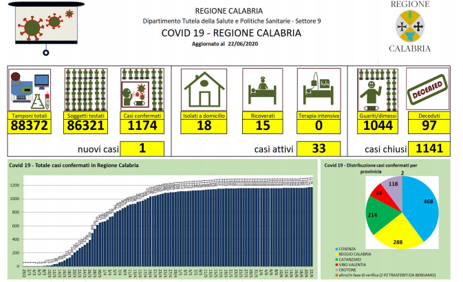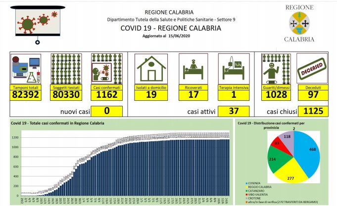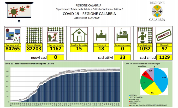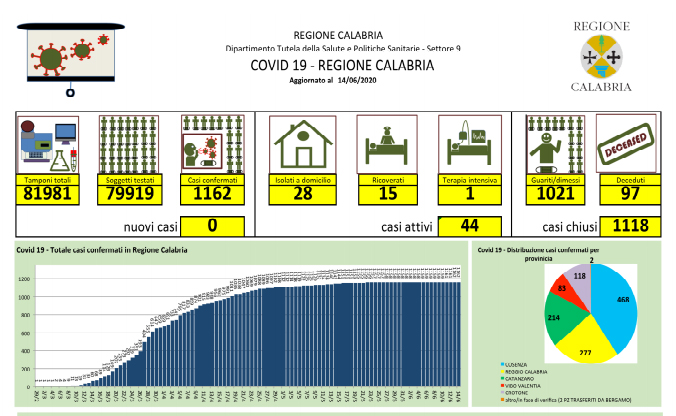 Covid-19, bollettino giornaliero della regione Calabria - In Calabria ad oggi le persone risultate positive al Coronavirus sono 1.162 (+0 rispetto a ieri), 97 le persone decedute - Territorialmente, i casi positivi sono così distribuiti: - Catanzaro: 15 in reparto; 1 in isolamento domiciliare; 168 guariti; 33 deceduti, - Cosenza: 1 in reparto; 9 in isolamento domiciliare; 424 guariti; 34 deceduti, - Reggio Calabria: 2 in reparto; 4 in isolamento domiciliare; 252 guariti; 19 deceduti, - Crotone: 112 guariti; 6 deceduti, - Vibo Valentia: 1 in isolamento domiciliare; 76 guariti; 5 deceduti. Il totale dei casi di Catanzaro comprende soggetti provenienti da altre strutture e province che nel tempo sono stati dimessi. Il paziente ricoverato al Policlinico Universitario di Catanzaro, proveniente da Vibo Valentia, non ha esigenze rianimatorie ma dovendo essere monitorato dopo l'infarto del miocardio rimane degente in terapia intensiva. Le persone decedute vengono indicate nella provincia di provenienza e non in quella in cui è avvenuto il decesso. Dall'ultima rilevazione, le persone che si sono registrate sul portale della Regione Calabria per comunicare la loro presenza sul territorio regionale sono in totale 4.113. Nel conteggio sono compresi anche i due pazienti di Bergamo trasferiti a Catanzaro, mentre non sono compresi i numeri del contagio pervenuti dopo la comunicazione dei dati alla Protezione Civile Nazionale.