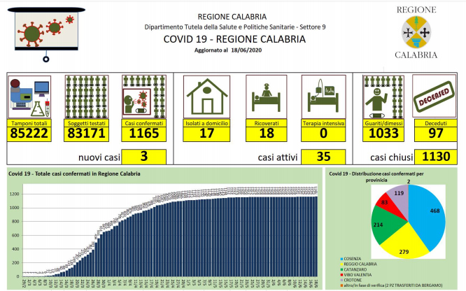 Covid-19, bollettino giornaliero della regione Calabria - In Calabria ad oggi le persone risultate positive al Coronavirus sono 1.165 (+3 rispetto a ieri) |