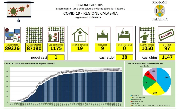 Covid-19, bollettino giornaliero della regione Calabria - In Calabria ad oggi le persone risultate positive al Coronavirus sono 1.174 (+1 rispetto a ieri), 97 le perspne decedute. Territorialmente, i casi positivi sono così distribuiti: - Catanzaro: 12 in reparto; 1 in isolamento domiciliare; 171 guariti; 33 deceduti, - Cosenza: 1 in reparto; 2 in isolamento domiciliare; 431 guariti; 34 deceduti, - Reggio Calabria: 2 in reparto; 13 in isolamento domiciliare; 254 guariti; 19 deceduti, - Crotone: 112 guariti; 6 deceduti, - Vibo Valentia: 2 in isolamento domiciliare; 76 guariti; 5 deceduti. Il totale dei casi di Catanzaro comprende soggetti provenienti da altre strutture e province che nel tempo sono stati dimessi. Il caso positivo di oggi è correlato al focolaio di Palmi. Le persone decedute vengono indicate nella provincia di provenienza e non in quella in cui è avvenuto il decesso. Dall'ultima rilevazione, le persone che si sono registrate sul portale della Regione Calabria per comunicare la loro presenza sul territorio regionale sono in totale 4.451. Nel conteggio sono compresi anche i due pazienti di Bergamo trasferiti a Catanzaro, mentre non sono compresi i numeri del contagio pervenuti dopo la comunicazione dei dati alla Protezione Civile Nazionale.