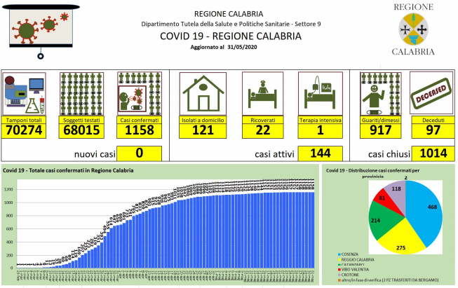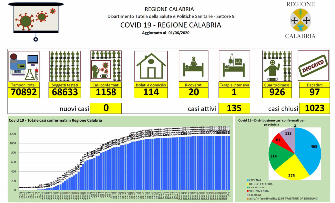 Covid-19, bollettino giornaliero della regione Calabria - In Calabria ad oggi le persone risultate positive al Coronavirus sono 1.158 (+0 rispetto a ieri), 97 le persone decedute |