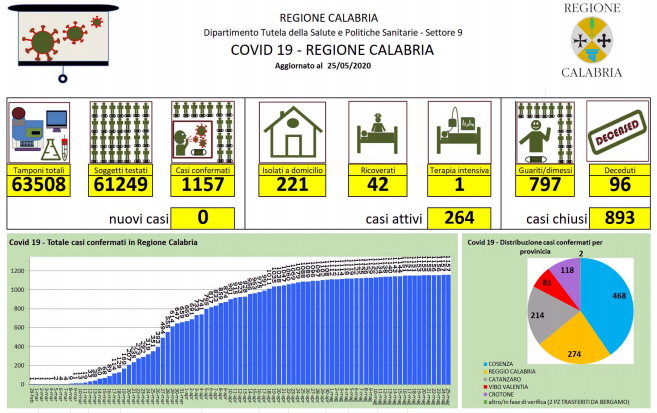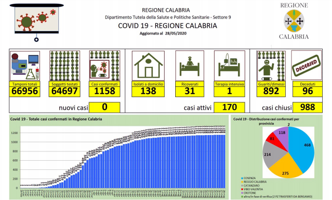 Covid-19, il bollettino giornaliero della regione Calabria - In Calabria ad oggi le persone risultate positive al Coronavirus sono 1.157 (+0 rispetto a ieri), 96 le persone decedute |