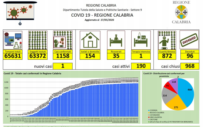 Covid-19, il bollettino giornaliero della regione Calabria - In Calabria ad oggi le persone risultate positive al Coronavirus sono 1.158 (+1 rispetto a ieri), 96 le persone decedute |