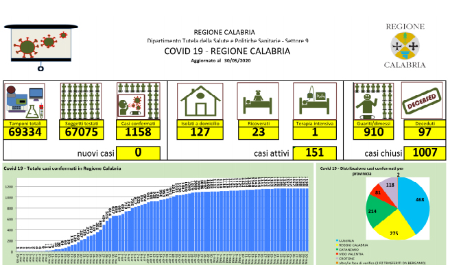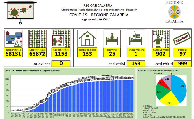 Covid-19, bollettino giornaliero della regione Calabria - In Calabria ad oggi sono le persone risultate positive al Coronavirus sono 1.158 (+0 rispetto a ieri), 97 le persone decedute |