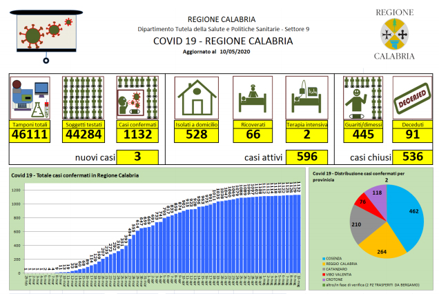Covid-19, bollettino giornaliero della regione Calabria - In Calabria ad oggi le persone risultate positive al Coronavirus sono 1.132 (+3 rispetto a ieri), 91 le persone decedute |
