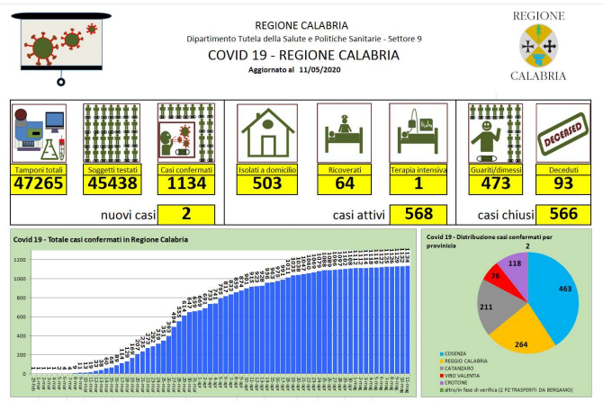 In Calabria ad oggi le persone risultate positive al Coronavirus sono 1.134 (+2 rispetto a ieri), 93 le persone sinora decedute |