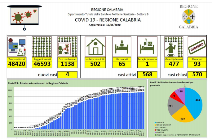 Covid-19, il bollettino giornaliero della regione Calabria - In Calabria ad oggi le persone risultate positive al Coronavirus sono 1.138 (+4 rispetto a ieri), 93 le persone decedute |
