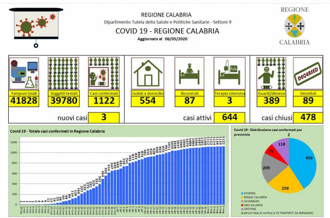 Covid-19, bollettino giornaliero della regione Calabria - Ad oggi le persone risultate positive al Coronavirus sono 1.122 (+3 rispetto a ieri), 89 le persone decedute. I 461 tamponi effettuati sui rientrati lo scorso 4 maggio, sono tutti negativi |