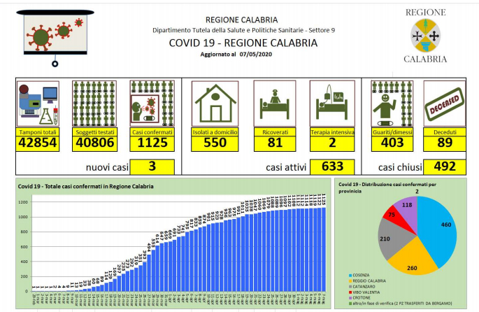 Covid-19, bollettino giornaliero della regione Calabria - In Calabria ad oggi le persone risultate positive al Coronavirus sono 1.125 (+3 rispetto a ieri), 89 le persone decedute, 3 i positivi tra i rientri |