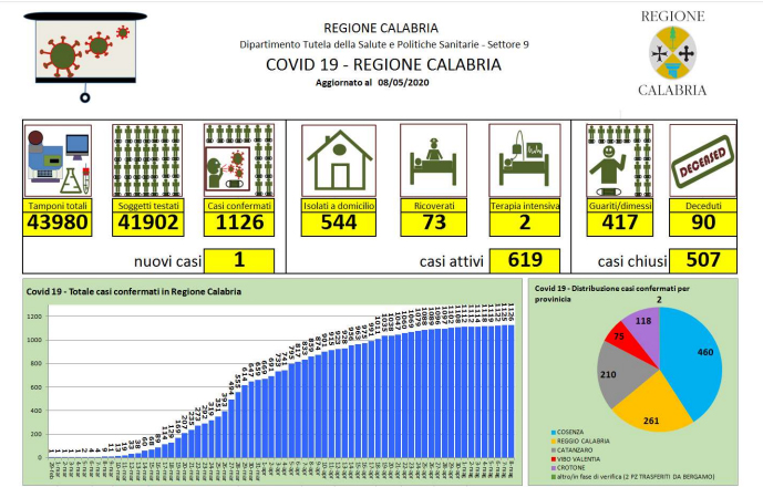 Covid-19, bollettino giornaliero della regione Calabria - In Calabria ad oggi le persone risultate positive al Coronavirus sono 1.126 (+1 rispetto a ieri), 90 le persone decedute sinora |