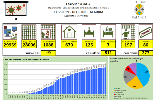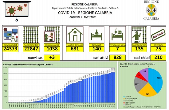Covid-19: Bollettino giornaliero della regione Calabria - In Calabria ad oggi le persone risultate positive al Coronavirus sono 1.047 (+9 rispetto a ieri), 76 le persone decedute. Ancora non definiti completamente i contagi di Villa Torano. Territorialmente, i casi positivi sono così distribuiti: - Catanzaro: 53 in reparto; 2 in rianimazione; 85 in isolamento domiciliare; 39 guariti; 27 deceduti, - Cosenza: 32 in reparto; 3 in rianimazione; 317 in isolamento domiciliare; 40 guariti; 23 deceduti, - Reggio Calabria: 31 in reparto; 2 in rianimazione; 150 in isolamento domiciliare; 45 guariti; 15 deceduti, - Crotone: 14 in reparto; 74 in isolamento domiciliare; 18 guariti; 6 deceduti, - Vibo Valentia: 3 in reparto; 53 in isolamento domiciliare; 10 guariti; 5 deceduti. Il totale dei casi di Catanzaro comprende soggetti provenienti da altre strutture e province che nel tempo sono stati dimessi. Torano: attualmente i contagiati risultano complessivamente 78. Ne sono stati notificati 22 il giorno 14 aprile, 36 il 16 aprile, 9 il 17 aprile, 11 il 18 aprile. Poiché sono ancora in corso screening e verifiche, i dati potranno essere ulteriormente aggiornati.Dei nove positivi di oggi, 6 sono contatti stretti riconducibili al focolaio di Torano. Le persone decedute vengono indicate nella provincia di provenienza e non in quella in cui è avvenuto il decesso. I soggetti in quarantena volontaria sono 6.922, così distribuiti: - Cosenza: 1.451, - Crotone: 1.576, - Catanzaro: 1.744, - Vibo Valentia: 356, - Reggio Calabria: 1.795. Le persone giunte in Calabria che ad oggi si sono registrate al sito della Regione Calabria sono 15.737. Nel conteggio sono compresi anche i due pazienti di Bergamo trasferiti a Catanzaro, mentre non sono compresi i numeri del contagio pervenuti dopo la comunicazione dei dati alla Protezione Civile Nazionale.