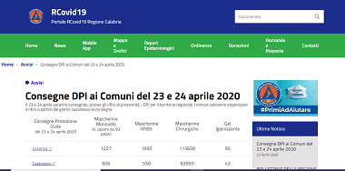 www.rcovid19.it e' il nuovo sito attivo da oggi in regione dedicato ad informazioni e servizi per cittadini e organi d'informazione su come gestire la Fase 2 dell'emergenza Covid-19. Ma non è l'unica novità messa in campo dalla Regione si: attende il rilascio della nuova App "RCovid19", che consentirà ai cittadini calabresi di ricevere notifiche sul cellulare sulle ultime disposizioni regionali e nazionali in materia di Coronavirus, notizie e aggiornamenti. Sui social, le medesime informazioni vengono veicolate dalla Pagina Facebook della Protezione Civile regionale, seguita da oltre 72.000 calabresi. Relativamente ai dispositivi di protezione individuali (DPI), la Protezione Civile regionale distribuirà, tra oggi e domani, altri 500.000 DPI a tutti i Comuni calabresi, dando priorità a quelli delle cosiddette Aree Rosse. All' ospedale di Castrovillari saranno consegnate 30 pacchi da 50 pezzi di mascherine monovelo, 3.950 mascherine chirurgiche e 4 confezioni di gel igienizzanti.