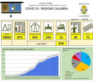 | CORONAVIRUS, IL BOLLETTINO GIORNALIERO DELLA REGIONE CALABRIA | et  at:  15/04/2020 |  |  Coronavirus, il bollettino giornaliero della regione Calabria - In Calabria ad oggi le persone risultate positive al Coronavirus sono 971 (+15 rispetto a ieri), 71 i decessi. Sono in corso di verifica gli ulteriori tamponi effettuati presso l' RSA di Torano. Territorialmente, i casi positivi sono così distribuiti: - Catanzaro: 58 in reparto; 4 in rianimazione; 89 in isolamento domiciliare; 23 guariti; 25 deceduti, - Cosenza: 45 in reparto; 4 in rianimazione; 229 in isolamento domiciliare; 18 guariti; 20 deceduti, - Reggio Calabria: 30 in reparto; 3 in rianimazione; 200 in isolamento domiciliare; 28 guariti; 15 deceduti, - Vibo Valentia: 6 in reparto; 50 in isolamento domiciliare; 7 guarito; 5 deceduti, - Crotone: 17 in reparto; 84 in isolamento domiciliare; 5 guariti; 6 deceduti. Le persone decedute vengono indicate nella provincia di provenienza e non in quella in cui è avvenuto il decesso. I soggetti in quarantena volontaria sono 7.055, così distribuiti: - Cosenza: 1.743, - Crotone: 1.463, - Catanzaro: 1.666, - Vibo Valentia: 457, - Reggio Calabria: 1.726. Le persone giunte in Calabria che ad oggi si sono registrate al sito della Regione Calabria sono 14.692. Nel conteggio sono compresi anche i due pazienti di Bergamo trasferiti a Catanzaro, mentre non sono compresi i numeri del contagio pervenuti dopo la comunicazione dei dati alla Protezione Civile Nazionale.
