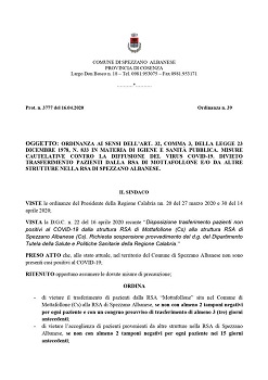 | CORONAVIRUS, IL COMUNE DI SPEZZANO ALBANESE SI CAUTELA CON UNA ORDINANZA E VIETA IL TRASFERIMENTO DALLA RSA DI MOTTAFOLLONE E DI ALTRE RSA NEL PROPRIO COMUNE | et  at:  16/04/2020 |  |  Coronavirus, il comune di Spezzano albanese si cautela con una ordinanza e vieta il trasferimento dalla RSA di Mottafollone e di altre RSA nel proprio comune - Con una ordinanza il sindaco di Spezzano albanese ha deciso di vietare il trasferimento di pazienti dalla RSA di Mottafollone alle strutture RSA di Spezzano albanese. L' unica possibilita' di trasferimento si legge nell' ordinanza è possibile se non dopo la verifica data da almeno due tamponi negativi per ogni paziente e con un congruo preavviso di trasferimento di almeno tre giorni antecedenti. Le clausole che sono da verificare per l' eventuale accoglienza, prevedono per ogni paziente anche in questo caso i due tamponi che devono essere risultati negativi ma, per ogni paziente nei 15 giorni antecedenti. L' ordinanza prevede inoltre che le due RSA di Spezzano Albanese: la Medical sport center srl e la Sanigest srl eseguano i tamponi agli ospiti e a tutto il personale.