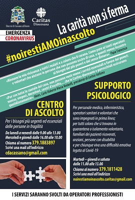 La Caritas diocesana di Cassano all' Jonio attiva il servizio di supporto psicologico. La Caritas diocesana di Cassano all' Jonio, in comunione con il Vescovo, mons. Francesco Savino ha attivato un nuovo servizio per supportare le persone in questo particolare momento di emergenza sanitaria per via della diffusione del Coronavirus. Oltre ad implementare la linea del Centro di Ascolto diocesano per i bisogni più urgenti delle persone in fragilità - fa sapere il vicario per la carità, don Gianni Di Luca - sarà attivo un nuovo servizio di supporto psicologico per personale medico, infermieristico, operatori sanitari e volontari che sono impegnati in prima linea; per tutti coloro che si trovano in quarantena o isolamento volontario, familiari dei pazienti ricoverati, anziani, persone con disabilità e per chiunque viva una difficoltà emotiva legata al Covid-19. Il Centro di Ascolto sarà attivo da lunedì a venerdì dalle 9.00 alle 13.00 e mercoledì e giovedì dalle 16.00 alle 18.00. Il numero di riferimento è 379.1883897 cdacassano@gmail.com Il Supporto Psicologico martedì, giovedì e sabato dalle 11.00 alle 13.00 Tel. 379.1811428 noirestiamoinascolto.caritas@gmail.com Il servizio sarà reso fruibile grazie alla disponibilità volontaria di una psicologa che provvederà a contattare direttamente, entro le 24 ore, tutti coloro che ne faranno richiesta. La Caritas diocesana desidera così ancor più farsi presente sul territorio diocesano di Cassano allo Ionio al fine di condividere le emergenti problematiche relative alla situazione pandemica del Covid-19. ( comunicato ) |