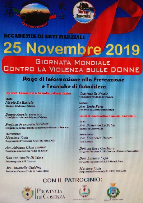 Giornata mondiale della violenza sulle donne, a Castrovillari e Morano evento congiunto il prossimo 25 novembre - Uno stage d’informazione sulla prevenzione e tecniche di autodifesa, in occasione della giornata mondiale contro la violenza sulle donne, e' il momento organizzato dall' Accademia di arti marziali, con piu' rappresentanze sul territorio, per il 25 novembre in un doppio appuntamento: la mattina, con inizio alle ore 10,30 a Morano, nel Monastero di San Bernardino, ed a partire dalle ore 18 nella Sala consiliare del palazzo di città di Castrovillari. L’iniziativa si avvale dei patrocini della Provincia di Cosenza e, naturalmente, dei Comuni di Morano Calabro e Castrovillari nonché della compartecipazione di organismi, associazioni ed altre istituzioni. A Morano interverranno il Sindaco, Nicolò De Bartolo, il consigliere comunale, Biagio Angelo Severino, la dirigente scolastica dell’istituto comprensivo, Francesca Nicoletti, il responsabile provinciale Ju Jitsu Fijlkam, Massimo Viola, che offrirà il proprio contributo anche nella seconda parte della giornata, la presidente dell’Associazione “Oltre la difesa”, Adriana Chiaromonte, la psicoterapeuta, Amalia Di Mare, il presidente della Camera Civile di Castrovillari, Antonella Gialdino, il consigliere provinciale, Graziano Di Natale, ed il portavoce di “Morano Democratica”, Sonia Forte. Mentre nel salone delle adunanze consiliari di Castrovillari oltre al Sindaco e Vice, rispettivamente Domenico Lo Polito e Francesca Dorato, daranno il proprio apporto la dirigente psicologa del Distretto , Rosa Cerchiara, e anche il dirigente nazionale del SIULP della Polizia di Stato, Luciano Lupo. |