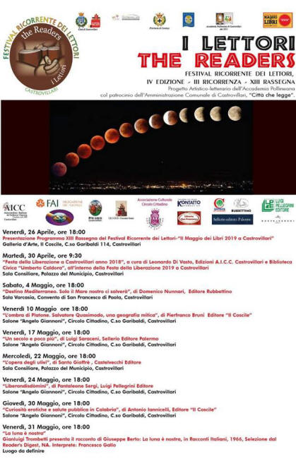 " Il Maggio dei Libri " 2019 a Castrovillari ", presentazione del programma venerdi', 26 Aprile, ore 18:00, Galleria d’Arte, Il Coscile - In occasione de " Il Maggio dei Libri " 2019, e' stata programmata la XIII Rassegna del Festival Ricorrente dei Lettori “The Readers” a Castrovillari, progetto dell’Accademia Pollineana che, in sinergia con altre associazioni del territorio, vuole impegnarsi in una campagna ricorrente (ben tre per ciascun anno di riferimento) che stimoli a leggere, riflettere, approfondire, partecipare alle iniziative programmate, anche sviluppando temi di portata nazionale. Le iniziative si svolgeranno tra il 30 aprile-Festa della Liberazione a Castrovillari a cura dell’A.I.C.C.- ed il 31 Maggio, in particolare nei seguenti giorni di Maggio: 4, 10, 17, 22, 24, 30 e 31. L’edizione del Maggio dei Libri a Castrovillari, alla cui campagna nazionale si ispira, intende sottolineare il valore sociale dei libri quale elemento chiave della crescita personale, culturale e civile della comunità. Dei temi previsti nella campagna nazionale, si è scelto di dare spazio a due in particolare : “Se questo è un uomo” (a cento anni dalla nascita di Primo Levi) opera nella quale l’autore racconta le sue terribili esperienze nel campo di sterminio nazista di Auschwitz e di cui saranno letti alcuni passi nella Giornata dedicata alla Festa della Liberazione a cura dell’AICC di Castrovillari e della Biblioteca Civica “U. Caldora” e “Guarda che luna! A cinquanta anni dall’allunaggio”( il 20 luglio 1969 avvenne lo sbarco del primo uomo al mondo su un corpo extraterrestre. L’americano Neil Armstrong, capitano della missione Apollo 11, atterrò sulla Luna e pronunciò la celebre frase: “Un piccolo passo per un uomo, un grande balzo per l’umanità). Per quest’ ultimo tema, giorno 31 Maggio, sarà presentato il racconto di Giuseppe Berto “La Luna è nostra”, che si ispira ad un evento di fantascienza che ha come protagonista un castrovillarese. Ospiti del Maggio dei Libri a Castrovillari saranno gli autori : Domenico Nunnari, Pierfranco Bruni, Luigi Saraceni, Santo Gioffrè, Pantaleone Sergi, Antonio Iannicelli. I dettagli del programma saranno svelati nella Conferenza stampa di giorno 26 Aprile, ore 18:00, presso la Galleria d’Arte e Casa Editrice “Il Coscile” in C.so Garibaldi 114 a Castrovillari. Introdurrà Mimmo Sancineto, editore. Interverranno Domenico Lo Polito, sindaco di Castrovillari, Carlo Lo Prete, consigliere provinciale, Donatella Laudadio, capo delegazione FAI Castrovillari, Mena Ferraro, segretaria Accademia Pollineana. Coordinerà Gianluigi Trombetti, bibliotecario Accademia Pollineana. |