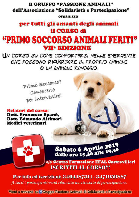 Castrovillari - Si e' conclusa con successo la settima edizione del corso " Primo soccorso animali feriti ". Anche quest' anno grande interesse per il " Corso di primo soccorso animali feriti ": un corso su come comportarsi nelle emergenze che possono riguardare il proprio animale o un animale randagio. Il corso , giunto alla settima edizione, si è svolto sabato 6 aprile presso il Centro di Formazione Efal di Castrovillari ed è stato organizzato dal Gruppo “Passione Animali” dell’associazione “Solidarietà e Partecipazione” di Castrovillari. L’iniziativa rientra tra le attività di sensibilizzazione che il gruppo “Passione animali” dell’associazione “Solidarietà e partecipazione” organizza ogni anno contro l’abbandono degli animali e il randagismo e al fine di un corretto rapporto tra le persone e gli animali. Relatori del corso sono stato i medici veterinari Dott. Francesco Spanò e Dott. Edmondo Altimari.