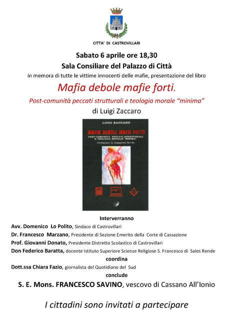 CASTROVILLARI, SALA CONSILIARE PRESENTAZIONE DEL LIBRO " MAFIA DEBOLE MAFIE FORTI. POST-COMUNITÀ, PECCATI STRUTTURALI E TEOLOGIA MORALE «MINIMA» " DI LUIGI ZACCARO |