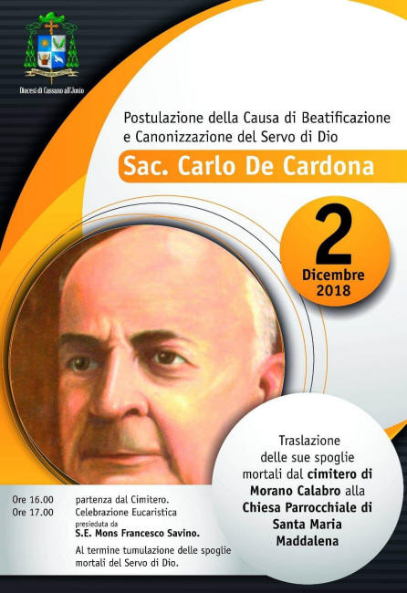 Morano calabro, domenica prossima traslazione dei resti mortali del Servo di Dio Carlo De Cardona dal cimitero alla chiesa Santa Maria Maddalena - Domenica 2 dicembre prossimo le spoglie mortali del Servo di Dio don Carlo De Cardona, sacerdote attivo nel secolo scorso in Calabria e costantemente impegnato per l’edificazione spirituale e sociale della classe operaia, saranno traslate dal cimitero di Morano Calabro – borgo dove nacque il 4 maggio 1881 e si spense il 10 marzo 1958 - alla chiesa parrocchiale Santa Maria Maddalena dello stesso Comune. La cerimonia promossa dalla Diocesi di Cassano Jonio vedrà il clero territoriale protagonista di una suggestiva liturgia che avrà inizio alle ore 16.00 con il raduno dei fedeli presso la tomba del prete moranese, posta al primo piano del locale luogo di sepoltura, e l’avvio in pompa magna - non prima di aver ultimato il commovente rito dell’estumulazione – della processione che, sotto la guida del vescovo, Francesco Savino, intonando le litanie dei santi, condurrà i resti di don De Cardona alla chiesa dove ricevette i sacramenti dell’iniziazione cristiana. Alle 17.00, sarà celebrata la Santa Messa presieduta dal presule cassanese, affiancato dai presbiteri, suoi collaboratori. Al termine si procederà con il posizionamento del feretro nel nuovo e definitivo sepolcro ricavato nel transetto della Collegiata, in corno epistola. |