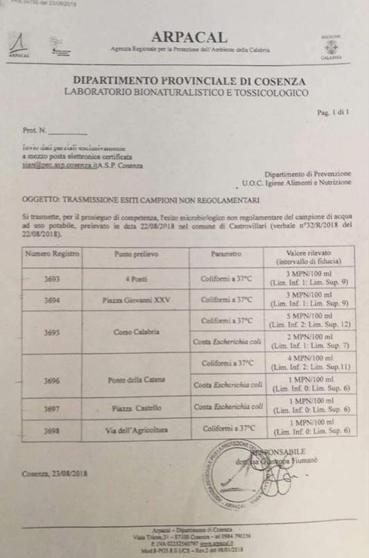 Castrovillari, acqua non potabile nelle seguenti zone: - Piazza Giovanni XXIII, - Ponte della Catena, - Piazza Castello, - 4 Ponti- C, orso Calabria, - Viale dell’Agricoltura e zone limitrofeS. La comunicazione arriva a firma del geometra Fedele Schifino responsabile comunale del settore 6 - Infrastrutture e si avvisa la popolazione che a seguito di comunicazione da parte del Dipartimento di Prevenzione – Unità operativa ASP di Cosenza - circa verifiche di potabilità dell’acqua dell’acquedotto cittadino, è emerso che l’acqua erogata nei suddetti punti è da ritenersi non potabile. Pertanto alla luce di quanto sopra, sin da SUBITO e fino a nuova disposizione, l’acqua per come indicata nella comunicazione ASP, potrà essere utilizzata solo per servizi igienici, se sottoposta a bollitura, per cucina. |