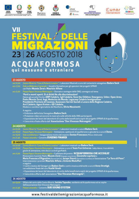 Acquaformosa, Festival delle Migrazioni edizione 2018 dal 23 al 26 agosto, previsti tra gli altri i concerti di Eugenio Finardi e Sud Sound System - Si apre un po' come s' era chiusa l' edizione 2018 del Festival delle Migrazioni di Acquaformosa e cioe' con l' invito a Salvini: «Venga a trovarci». E' la richiesta degli ultimi anni di Giovanni Manoccio, delegato per l’emigrazione della Regione Calabria, l' invito al massimo rappresentante del Viminale è a prendervi parte, lanciandogli il guanto di sfida: «Chi si avventura nelle acque del Mediterraneo a bordo delle carrette del mare, non va in crociera. Né i migranti morti a Foggia sono giunti in Italia per fare la pacchia». Qui nessuno è straniero recita il sottotitolo della locandina che invita alla kermesse, alla quale parteciperanno anche i rappresentanti di Sos Mediterranée e di Open Arms per un dibattito sul ruolo delle Ong, anche alla luce degli ultimi respingimenti in mare. Tra gli appuntamenti anche un concerto di Eugenio Finardi, cene etniche, laboratori musicali e la consegna del premio " Acquaformosa che accoglie ", la serata conclusiva prevede il concerto dei Sud Sound System. Nel corso della sua storia il Festival ha avuto come mission la sensibilizzazione verso la tematica dell’immigrazione, tematica quanto mai attuale visto il contesto internazionale e il momento storico. Diversi sono stati gli ospiti che hanno animato le varie edizioni del Festival che nel corso degli anni è cresciuto sensibilmente ed è, a oggi, uno dei principali eventi culturali per quanto riguarda l’accoglienza e l’integrazione in Italia. E, se nel 2013 era presente l’allora Ministro dell’Integrazione e attuale Eurodeputata del Pd Cécile Kyenge, è dell’edizione 2015 il vero e proprio boom della manifestazione che è stata attenzionata dai vari media nazionali. La conferma della crescita del Festival si è avuta con l’edizione 2016. La manifestazione è stata presa di mira da Matteo Salvini e dai suoi sostenitori, i giornali nazionali hanno parlato dell’accaduto. Ma, proprio dopo l’edizione 2016, il Festival è diventato oggetto di studio nel cuore d’Europa. Una delegazione, infatti, ha partecipato alla 34/esima edizione del Festival des migrations, des cultures et de la citoyenneté in Lussemburgo. Un ulteriore balzo in avanti è stato registrato nell’edizione 2017, quella dei record. Oltre 50 testate giornalistiche di tutto il mondo hanno parlato dei contenuti del Festival e della novità di stagione: il premio Acquaformosa che Accoglie. Proprio in occasione dell’assegnazione di questo riconoscimento c' è stato l’abbraccio tra il Vescovo di Cassano, Mons. Francesco Savino e l’Imam di Acquaformosa, Ahmed Berrou. |