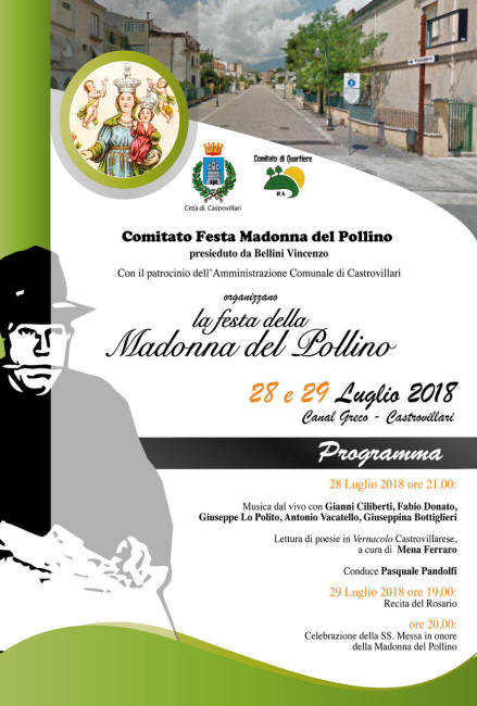 Castrovillari, Il 28 e 29 luglio, su canal Greco festa della Madonna del Pollino - Si rinnova l' appuntamento atteso da tanti fedeli, il 28 e 29 luglio, su canal Greco, con il patrocinio dell’Amministrazione comunale di Castrovillari e l’apporto del Quartiere n.4, il Comitato Festa Madonna del Pollino presieduto da Vincenzo Bellini rinnova l’impegno fedele all’ormai consueta celebrazione, tanto cara ai residenti e all’indimenticabile artista Luigi Le Voci- ritratto nel manifesto- L’appuntamento prevede, a partire dalle ore 21, uno spettacolo di musica dal vivo con Gianni Ciliberti, Fabio Donato,Giuseppe Lo Polito, Antonio Vacatello e Giuseppina Bottiglieri. Durante il momento uno spazio dedicato alla lettura di poesie in vernacolo castrovillarese a cura di Mena Ferraro- guidate da Pasquale Pandolfi- che farà rivivere situazioni, umori, stati d’animo che solo la lingua locale sa esprimere con proprie sfumature uniche. Domenica 29 luglio, invece, la Festa alle ore 19 si caratterizzerà con la recita del Rosario alla Madonna e, a seguire, la Santa Messa. |