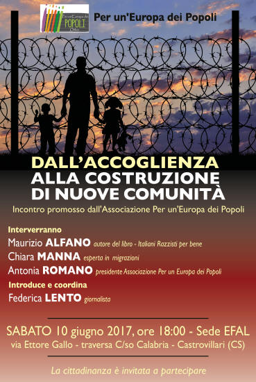 CASTROVILLARI, " DALL' ACCOGLIENZA ALLA COSTRUZIONE DI NUOVE COMUNITA' " SE NE DISCUTE PRESSO LA SEDE EFAL A CURA DELL' ASSOCIAZIONE "PER UN' EUROPA DEI POPOLI " |