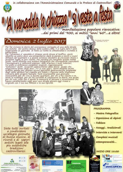 Castrovillari, " a Vanedda a chiazza " si veste a festa il 2 luglio - Serata estemporanea " nda vanedda a chiazza " il prossimo 2 luglio, a partire dalle ore 18 la storica strada cittadina che da sempre rievoca l' anima di Castrovillari si vestira' a festa per condividere all' insegna della buona musica e non solo, ricordi e sapori antichi legati alle piu' autentiche tradizioni castrovillaresi e piu' in generale agli anni che vanno dai primi del novecento agli inizi degli anni settanta. La manifestazione nel cui programma è previsto: l' esposizione di dipinti, una mostra fotografica, gli assaggi tradizionali, tanto folklore, musica ed estemporaneita' rigorosamente a cura di gruppi castrovillaresi, è organizzata in collaborazione con il comune di Castrovillari e la Proloco cittadina. Un' occasione come recita la locandina per far rivivere la storia del microcosmo variegato di una delle strade piu' antiche del centro storico. |
