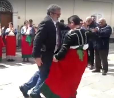 ACQUAFORMOSA, METAFORICO PASSO FALSO PER MICHELE EMILIANO, CANDIDATO ALLA SEGRETERIA DEL PD, SI FA MALE BALLANDO CON UN GRUPPO FOLK CALABRO-ALBANESE. |