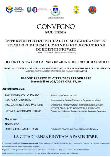 CASTROVILLARI L' 8 MARZO CONVEGNO SULLE OPPORTUNITA' CIRCA I FINANZIAMENTI PER L' ADEGUAMENTO SISMICO, CONCLUDE I LAVORI CARLO TANSI RESPONSABILE DELLA PROTEZIONE CIVILE REGIONALE |