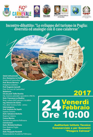 59° CARNEVALE DI CASTROVILLARI ANNO 2017- FOCUS PUGLIA, II FESTIVAL ANTROPOLOGICO DEI POPOLI , XII FESTA DELLE CULTURE E CARNEVALE GLOCALE, INCONTRO-DIBATTITO: " LO SVILUPPO DEL TURISMO IN PUGLIA, DIVERSITA' E ANALOGIE CON IL CASO CALABRESE " |