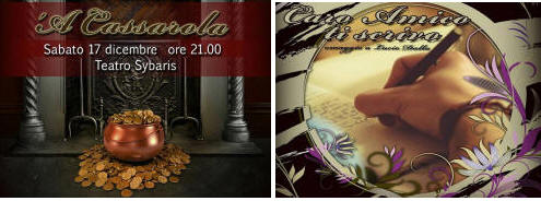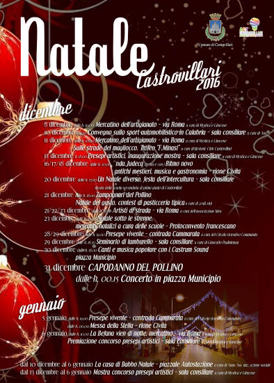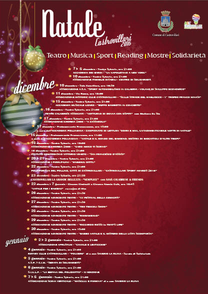 Alcuni appuntamenti in citta' dal 19 dicembre all' 8 gennaio tra Teatro, Musica, Sport,Reading, Mostre e Solidarieta'. 19 dicembre 19 dicembre - Teatro Sybaris, ore 21:00 ISTITUTO COMPRENSIVO VITTORIO VENETO - " SAN FRANCESCO D’ASSISI " - 20 > 21 dicembre - Teatro Sybaris, ore 21:00 ASSOCIAZIONE I PIRRUPAJINI - " HAGGHJU DITTU " - 22 dicembre - Teatro Sybaris, ore 21:00 POLISPORTIVA DEL POLLINO, CITTÀ DI CASTROVILLARI - “CASTROVILLARI SPORT AWARDS 2016” - 23 dicembre - Teatro Sybaris, o re 21:30 - CASTROVILLARI LA GRANDE BELLEZZA - “SEMPLICE” con SASÀ CALABRESE & FRIENDS - 23 dicembre > 7 gennaio - Cinema Ciminelli e Cinema Atomic Cafè, ore 10:45 “NATALE PER I BAMBINI” rassegna di film - 26 dicembre - Teatro Sybaris, ore 21:30 ASSOCIAZIONE NOVECENTO TEATRI - “XV FESTIVAL DELLA COMICITÀ” - 27 dicembre - Teatro Sybaris, ore 21:30 ASSOCIAZIONE NOVECENTO TEATRI - “TEO TEOCOLI SHOW” - 28 dicembre - Teatro Sybaris, ore 21:30 - ASSOCIAZIONE NOVECENTO TEATRI - “RIMBAMBAND” - 29 dicembre - Teatro Sybaris, ore 21:30 - ASSOCIAZIONE NOVECENTO TEATRI - “RICCARDO ROSSI in THAT’S LIFE” - 30 dicembre - Teatro Sybaris, ore 18:00 - ASSOCIAZIONE NOVECENTO TEATRI - “BABBO NATALE E IL MISTERO DELLA LISTA SCOMPARSA” - 2 > 3 gennaio - Teatro Sybaris, ore 21:00 ASSOCIAZIONE APRUSTUM - “CAVIALE E LENTICCHIE” - 4 gennaio - Teatro Sybaris, ore 21:00 ROTARY CLUB CASTROVILLARI - “POLVERE” di e con SAVERIO LA RUINA - Serata di Solidarietà - 5 gennaio - Teatro Sybaris, ore 21:00 A.S.P. > C.I.M. “SERATA DI SOLIDARIETÀ” - 6 gennaio - Teatro Sybaris, ore 21:00 S.I.U.L.P. - “LA BEFANA DEL POLIZIOTTO” - XI EDIZIONE - 7 > 8 gennaio - Teatro Sybaris, ore 21:00 ASSOCIAZIONE SCENA VERTICALE - “MASCULU E FIMMINA” di e con SAVERIO LA RUINA.
