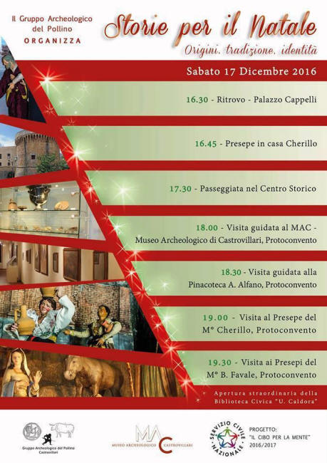 Castrovillari: " Storie per il Natale ", l' occasione itinerante per vivere origini, tradizione e identita', sabato 17 dicembre alle 16,30. Organizzato dal Gruppo Archeologico del Pollino, si terra' il prossimo sabato 17 dicembre un appuntamento con quanti hanno interesse e voglia di riscoprire alcuni angoli cittadini dedicati al Natale e contestualmente visitare il Museo archeologico e la Biblioteca civica " U. Caldora ". L' orario per il ritrovo è stato fissato per le 16,30 davanti a Palazzo Cappelli, alle 16,45 la comitiva si sposterà in casa Cherillo per ammirare l' originale presepe, alle 17,30 seguirà la Passeggiata nel centro storico e tra le 18 e le 18,30 sono previste le visite guidate al MAC ( Museo archeologico di Castrovillari ) e alla Pinacoteca " Andrea Alfano ", seguiranno infine le visite ai due presepi ubicati nel Protoconvento francescano dei maestri Cherillo e Favale. Per l' occasione è prevista l' apertura straordinaria della Biblioteca civica. |