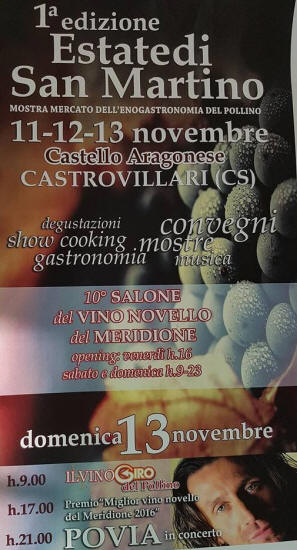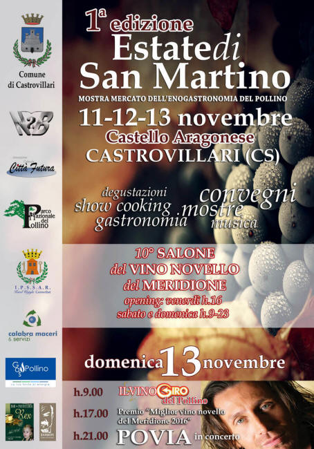 Castrovillari, omaggio all' estate di san Martino si chiude con il concerto di Povia. Dall' 11 al 13 novembre prima edizione dell' omonima mostra-mercato dell' enogastronomia del Pollino. Si terra' dall' 11 al 13 novembre prossimo la prima edizione della mostra mercato dell' enogastronomia del Pollino denominata: " Estate di san Martino ", una tre giorni dedicata allo show cooking con degustazioni tipiche del Pollino ma anche ai vini la manifestazione per l' occasione ospiterà la 10a edizione del " Salone del vino novello del meridione " e, sempre in tema sono previsti mostre e convegni. A chiusura della kermesse il concerto di Povia domenica 13 novembre a partire dalle ore 21 e sempre domenica alle 17 la premiazione del "Miglior vino novello del meridione 2016 ". Le serate sono ad ingresso libero e gli eventi saranno ospitati presso il Castello aragonese. |