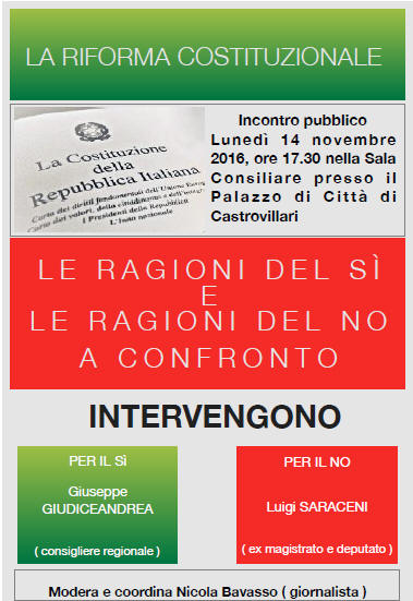 CASTROVILLARI - REFERENDUM COSTITUZIONALE DEL 4 DICEMBRE LE RAGIONI DEL SI E LE RAGIONI DEL NO A CONFRONTO LUNEDI' 14 NOVEMBRE |
