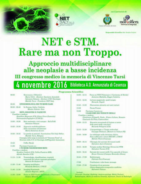 Tumori rari , l' importanza di fare rete, convegno scientifico all' Annunziata di Cosenza - Si e' svolto lo scorso 4 novembre 2016, a Cosenza, c/o la Biblioteca del Presidio Ospedaliero dell' Annunziata un incontro scientifico con oggetto: Tumori Neuroendocrini e Sarcomi dei Tessuti Molli. Gli specialisti, alcuni provenienti da centri di riferimento di fuori regione, si sono confrontati per l' intera giornata su questi difficili temi, coinvolgendo anche le associazioni dei pazienti. Molto soddisfatti gli organizzatori dell'evento Dr Conforti e Dr Turano, che hanno sottolineato l'importanza di "fare rete", soprattutto nell' ambito dei tumori rari. La regione Calabria in questo ambito sta crescendo molto, soprattutto con la creazione da quasi un anno di Re.Ca.Tur. la rete calabrese tumori rari, in diretto contatto con la Rete Nazionale Tumori Rari (RTR), coordinata dal gruppo di Milano. Concetto questo ribadito più volte anche dal Dr Palazzo, direttore della UO di Oncologia di Cosenza. |