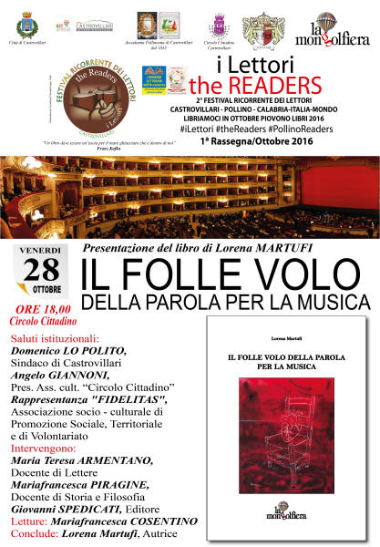 CASTROVILLARI - VENERDI' 28 OTTOBRE, ALLE ORE 18.00, AL CIRCOLO CITTADINO PRESENTAZIONE DEL SAGGIO " IL FOLLE VOLO DELLA PAROLA PER LA MUSICA ", SCRITTO DA LORENA MARTUFI |