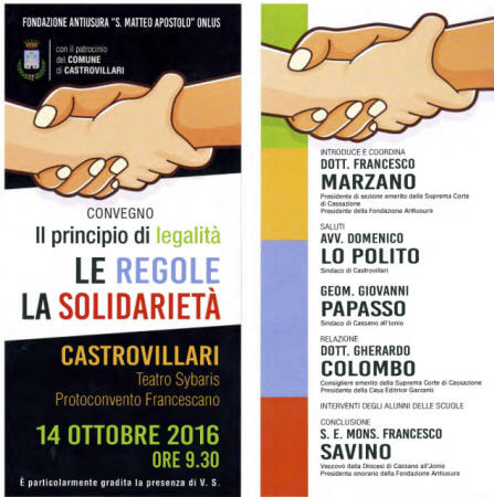 CASTROVILLARI, " IL PRINCIPIO DI LEGALITA'. LE REGOLE, LA SOLIDARIETA' " CONVEGNO AL PROTOCONVENTO VENERDI' 14 OTTOBRE |