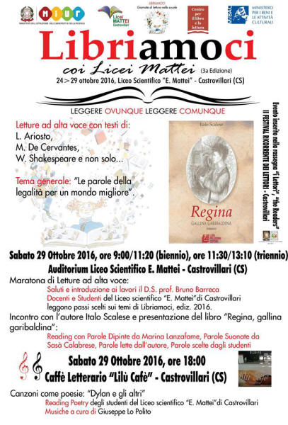 Castrovillari - Libriamoci coi Licei Mattei III Edizione. Sabato 29 Ottobre, a partire dalle ore 9:00, presso l' Auditorium del Liceo Scientifico " E. Mattei " di Castrovillari, si terra' la terza edizione della manifestazione " Libriamoci coi Licei Mattei ", con doppia maratona di Letture ad alta voce per gli studenti del biennio (ore 9:20/11:20) ed a seguire per quelli del triennio. Porgera' i saluti istituzionali il DS prof. Bruno Barreca. Le letture degli studenti verteranno principalmente sui temi proposti a livello nazionale per l’attuale edizione di Libriamoci 2016, che sono: Legalità (tema principale); William Shakespeare (IV centenario della morte); Miguel de Cervantes (IV centenario della morte); Ludovico Ariosto (V centenario de L’Orlando furioso), ma sarà possibile scegliere anche temi ed autori diversi, i cui testi saranno introdotti da una breve motivazione alla scelta, da parte del lettore di turno, contrassegnata dall’#ioleggoperchè. Ospite d’onore per il Progetto “Incontro con l’autore”, durante la manifestazione, lo scrittore Italo Scalese, autore del libro “Regina, gallina garibaldina”, Pellegrini Edizioni. Insomma, “un evento nell’evento” con la presentazione del libro di I. Scalese in forma di reading con parole dipinte da Marina Lanzafame, parole suonate da Sasà Calabrese, parole lette dall’autore, parole scelte dagli studenti. Sempre nella stessa giornata di sabato p.v., in prima serata, alle ore 18:00, presso il Caffè Letterario “Lilù cafè”, in C.so Garibaldi a Castrovillari, alcuni studenti saranno protagonisti dell’evento “Canzoni come poesie. Dylan e gli altri”. Gli intermezzi musicali saranno curati dal prof. Giuseppe Lo Polito, le letture da un gruppo selezionato di studenti dei “Licei Mattei”. Presenterà Francesca Fortugno. Fotogallery a cura di Ilaria Di Vasto. La cittadinanza e tutti gli interessati sono invitati ad intervenire. Ingresso libero presso “Lilù cafè”, Caffè Letterario. ( Referente Comunicazioni Esterne Prof.ssa Filomena Bloise ) |
