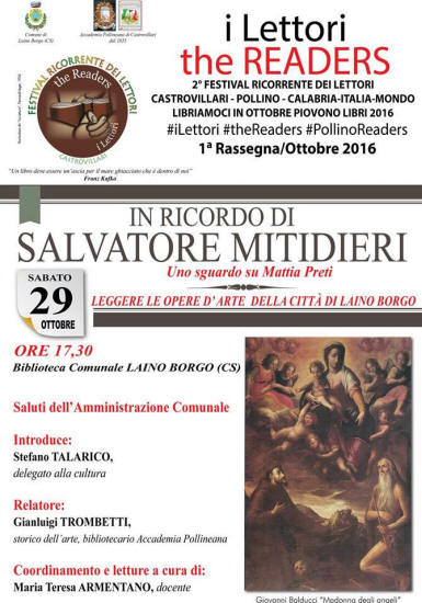 Sabato 29 Ottobre, ore 17:30 Biblioteca comunale di Laino Borgo: In ricordo di Salvatore Mitidieri. Incontro con Gianluigi Trombetti e Maria Teresa Armentano. Uno sguardo su Mattia Preti. " Leggere le opere d' arte della Citta' di Laino Borgo " - Sabato 29 Ottobre, alle ore 17.30, su iniziativa dell' Accademia Pollineana di Castrovillari, a conclusione della I rassegna del 2° Festival ricorrente dei Lettori “The Readers”, che aderisce alla campagna nazionale “Libriamoci” (in “Ottobre piovono libri”), la Biblioteca Comunale di Laino Borgo accoglierà l’incontro con Gianluigi Trombetti e Maria Teresa Armentano per celebrare la memoria e l’opera del poeta Salvatore Mitidieri. Tema principale dell’incontro: “Leggere le opere d’ arte della Città di Laino Borgo”. Sono previsti i Saluti dell’Amministrazione Comunale. Introdurrà ai lavori Stefano Talarico, Delegato alla cultura. Relazionerà Gianluigi Trombetti, Storico dell’arte, Bibliotecario dell’Accademia Pollineana, che nell’occasione consegnerà ai massimi rappresentanti delle istituzioni cittadine presenti preziosi documenti settecenteschi reperiti durante le sue ricerche archivistiche. Le Letture e il coordinamento sono affidati a Maria Teresa Armentano, Docente e Scrittrice. Sarà presente tutto il Consiglio direttivo dell’Accademia Pollineana, presieduto da Filomena Bloise. La cittadinanza e tutti gli interessati sono invitati ad intervenire. Da Segreteria Accademia Pollineana |